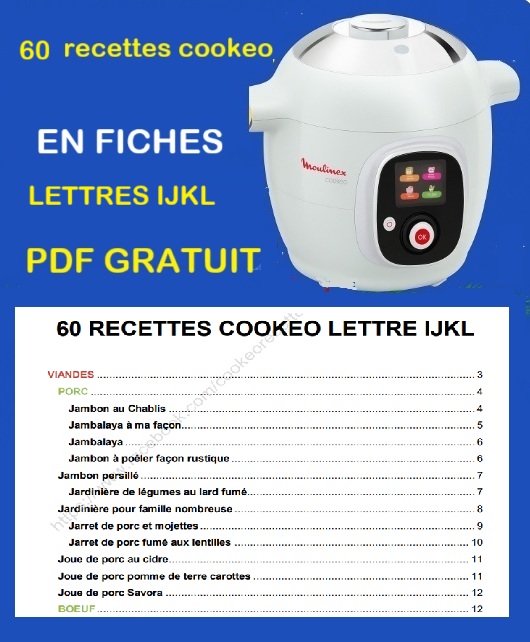 Vous trouverez dans de PDF 60 Recettes cookeo classées par ordre alphabétique avec les lettres IJKL .Vous pouvez télécharger gratuitement ce PDF en cliquant sur l’image .
