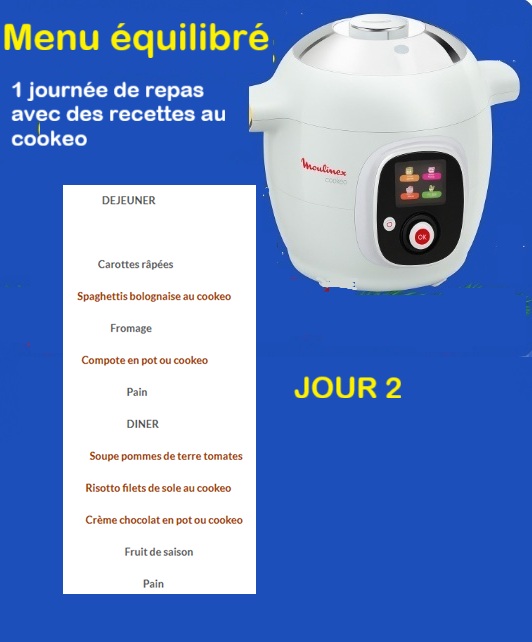 Allez c’est parti pour le jour 2 je vous propose cette deuxième journée de menus équilibrés avec des recettes réalisées au cookeo. Pas toutes mais une partie. Tous les plats ne se réalisent pas au cookeo. Généralement des plats de viandes ou poissons et certains desserts vous sont proposés au Cookeo. Chacun sera libre bien sûr d’adapter les recettes que ce soit au niveau de la composition mais aussi du mode de cuisson.