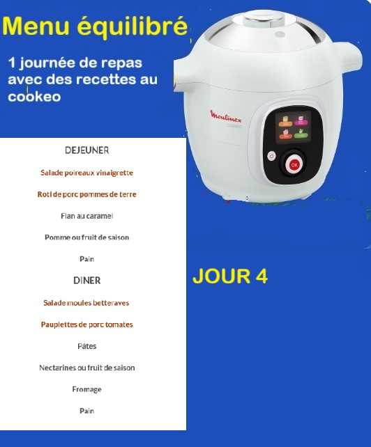 Allez c’est parti pour le jour 4 je vous propose cette troisième journée de menus équilibrés avec des recettes réalisées au cookeo. Pas toutes mais une partie. Tous les plats ne se réalisent pas au cookeo. Généralement des plats de viandes ou poissons et certains desserts vous sont proposés au Cookeo. Chacun sera libre bien sûr d’adapter les recettes que ce soit au niveau de la composition mais aussi du mode de cuisson.