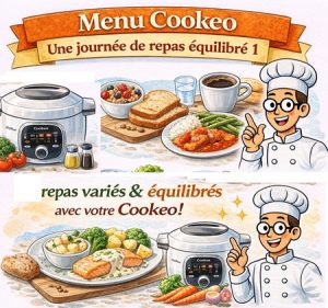 Allez c’est parti je me lance je vous propose donc cette première journée de menus équilibrés avec des recettes réalisées au cookeo. Pas toutes mais une partie. Tous les plats ne se réalisent pas au cookeo. Généralement des plats de viandes ou poissons et certains desserts vous sont proposés au Cookeo. Chacun sera libre bien …
